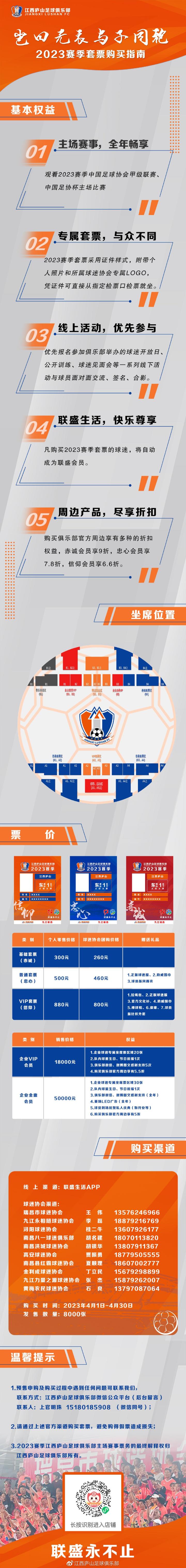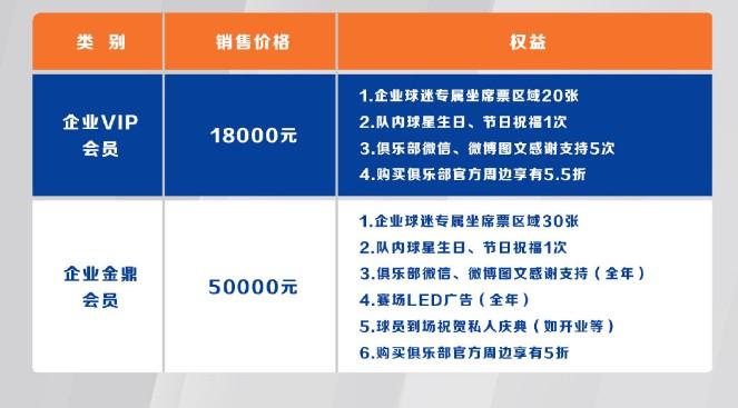 此外,江西庐山俱乐部还开售企业VIP会员以及企业金鼎会员,价格分别为18000元以及50000元,企业球迷可享受专属坐席票,队内球星生日、节日祝福,俱乐部微信、微博图文感谢支持,俱乐部官方周边折扣等权益。金鼎会员还可享受赛场LED广告,球员到场祝贺私人庆典等权益。