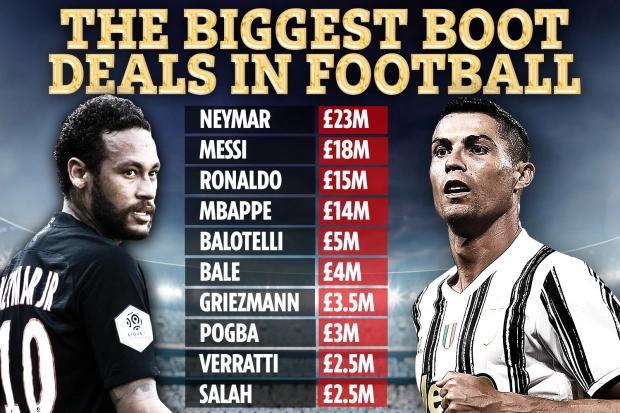 耐克2019年和姆巴佩签了十年的合同,每年是1400万英镑,C罗2016年和耐克续约的合同每年是1500万英镑,阿迪给梅西的合同每年代言费是1800万英镑,和哈兰德差不多,1800万英镑也就是2000万欧元左右。不过梅西和哈兰德还不是球鞋代言费最高的足球运动员,去年彪马给内马尔的代言合同每年费用达到了2300万英镑,是历史第一了。