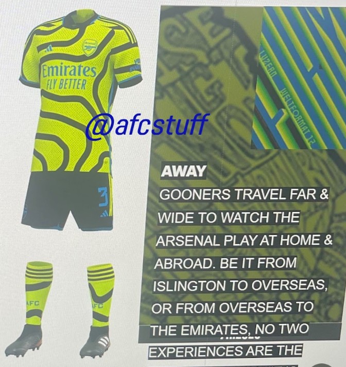 据足球装备爆料网站footyheadlines报道,阿森纳下赛季的客场球衣,将会采用奇特的黄绿色配色。