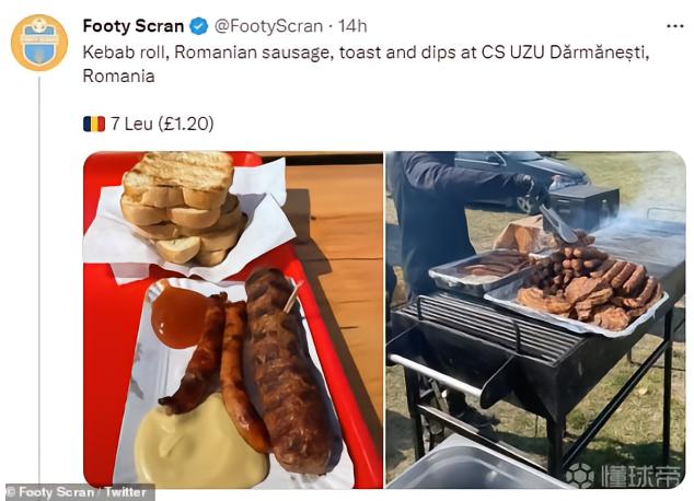 一支罗马尼亚球场主场所提供的食物:1根kebab肉棒、2根罗马尼亚香肠、5片烤面包片以及2种不同的酱,这些加在一起只需要1.2英镑。