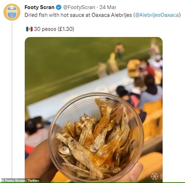上图是一支墨西哥球队的主场所提供的食物:鱼干搭配酱料,售价折合英镑为1.3英镑。