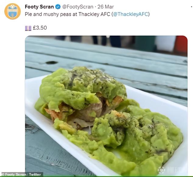 英格兰第9级别联赛球队Thackley AFC的主场提供的“肉派+酱”,顶部的酱是将豌豆一类的豆子打成泥制成的,售价为3.5英镑。