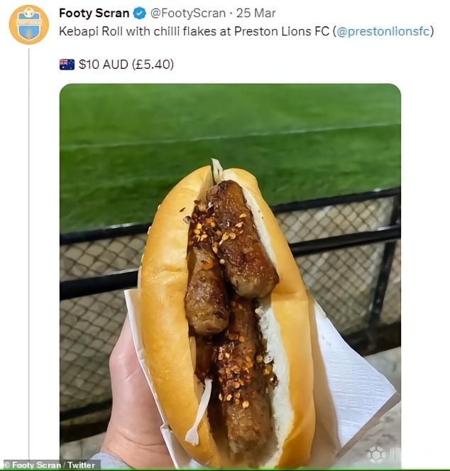 澳大利亚第3级别联赛球队Preston Lions FC主场出售的热狗,每只5.4英镑,一只热狗中包含有3根香肠,它们混合了牛肉和羊肉。
