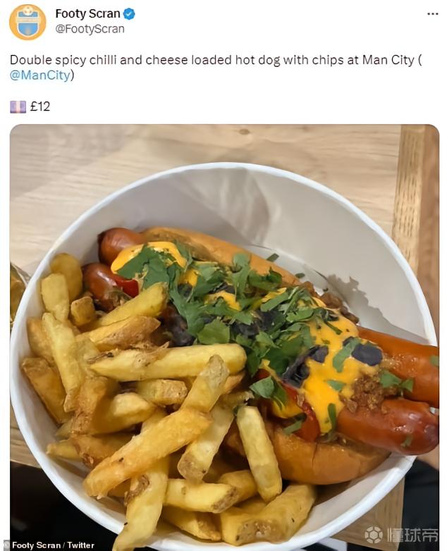 上图为曼城主场出售的双香肠热狗加薯条,它的售价很高,达到了12英镑,但是看起来有食欲得多。
