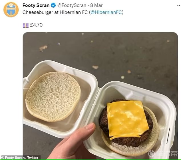 苏格兰球队希伯尼安主场出售的起司汉堡,售价4.7英镑。《邮报》指出,如果食物本身的质量可以,那么这个价格是能够令人接受的,然而食物的质量并不能令人满意。