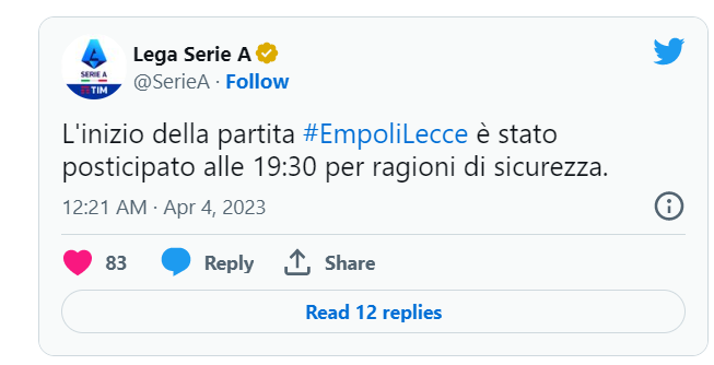 无奇不有——今晚本来连续解说意甲28轮最后两场,...足球解说-石庆圣 @懂球帝2023-04-04 00:54无奇不有——今晚本来连续解说意甲28轮最后两场,但是北京时间0点30分恩波利VS莱切比赛 ,由于恩波利主场更衣室短路引起小范围火灾,比赛推迟1小时进行,直接影响我无法解说下一场萨索洛VS都灵比赛……遇到过恶劣天气,灯坏了,交通拥堵延时的,第一次遇到火灾……展开更多
