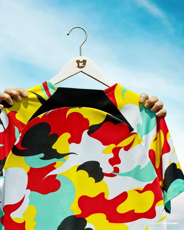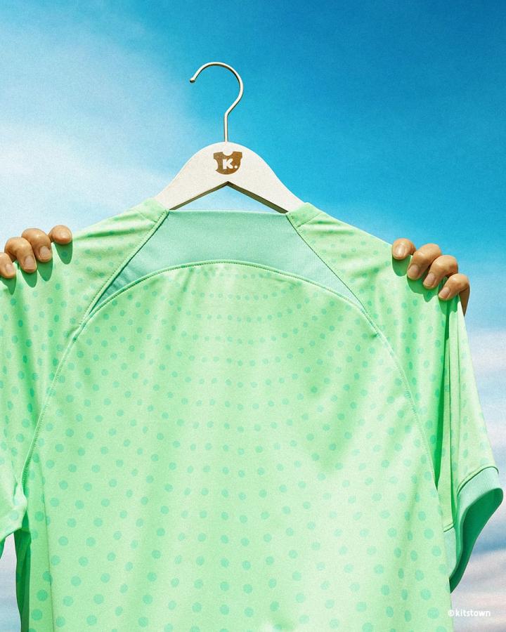 客场球衣则使用了清凉的绿色,并有着起伏的波点暗纹。此外,还有赛前热身服,采用了彩色不规则图案的设计。