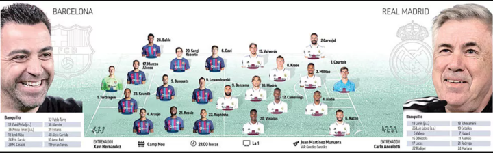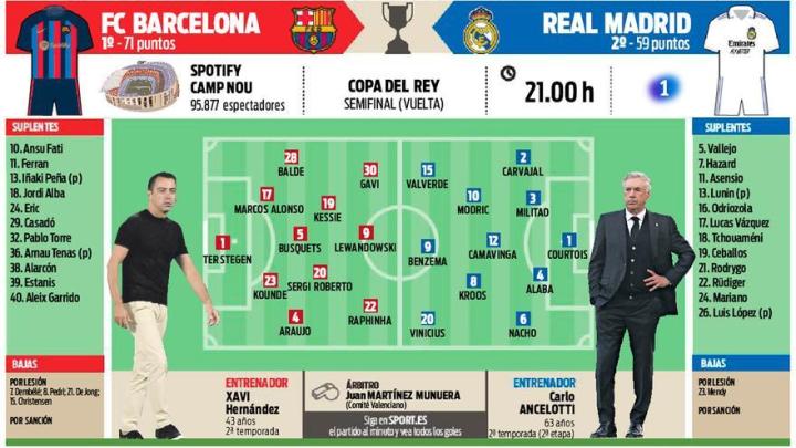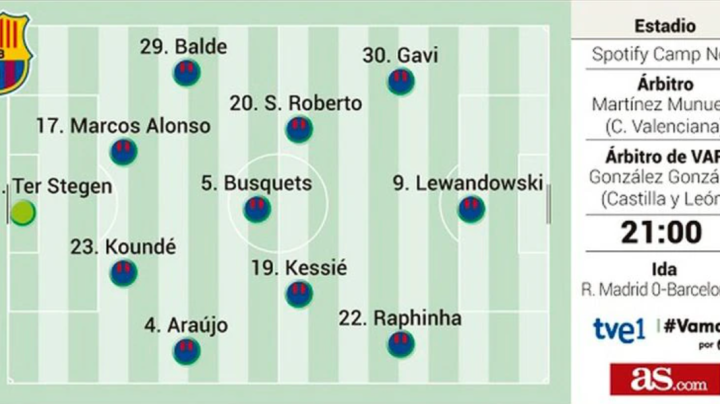 继续四中场?巴萨能否实现对阵皇马四连杀,闯入国王杯决赛? 对阵皇马的第254次国家德比,是本赛季双方第五次,也是最后一次交锋,巴萨不败即可晋级国王杯决赛,本赛季前4场比赛,巴萨3胜1负。 由于巴萨遭遇伤病困扰,佩德里、德容和登贝莱均未入选大名单,哈维的首发名单猜测也相对容易。 西媒《每日体育报》、《世界体育报》、《马卡报》和《阿斯报》预测的巴萨首发均一致: 门将:特尔施特根 后卫:巴尔德、马科斯-阿隆索、孔德、阿劳霍 中场:布斯克茨、凯西、罗贝托 前锋:加维、拉菲尼亚、莱万 此前对阵皇马的三连胜,哈维均排出了四中场阵容,此役又会是四中场,这一次哈维能否率领巴萨实现对阵皇马的4连胜,将总战绩扳平(目前100胜52平101负)呢?
