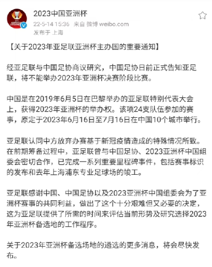 其实,中国足协及组委会是主动向亚足联提出放弃承办亚洲杯的,这也让中国足协陷入被动。当时有资深外事工作人员建议,不直接以“能”或“不能”回复亚足联关于疫情对亚洲杯承办前景的影响,只表达中国足协和组委会将全力做好赛事筹备,届时根据国家防疫政策决定亚洲杯是否延期或易址。