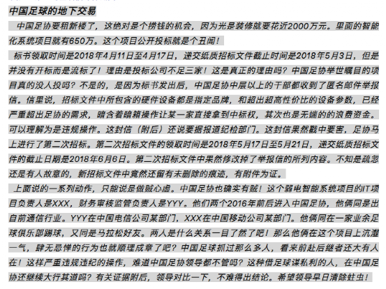在中国足协搬到世东国际大厦之前进行前期装修的时候,2018年4月29日、6月5日,中国足协工作邮件组先后收到了匿名信。4月29日的匿名信标题是《中国足球协会智能化弱电系统改造工程存在重大问题情况通报》。6月5日匿名信的标题是:《中国足球的地下交易》。两封匿名信,内容都指向了中国足协新办公楼装修工程的智能化系统项目招标。这项招标的标的是650万。