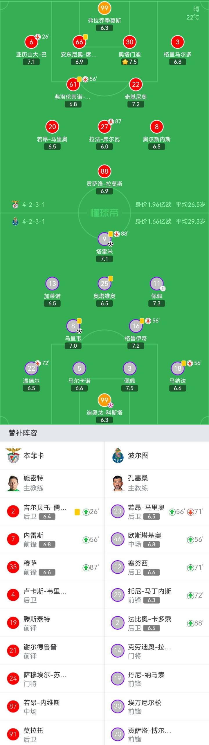 本菲卡首发:99-弗拉乔季莫斯、6-亚历山大-巴(26'2-吉尔贝托-儒尼奥尔)、66-安东尼奥-席尔瓦、30-奥塔门迪、3-格里马尔多、61-弗洛伦蒂诺-路易斯(56'7-内雷斯)、22-奇基尼奥、20-若昂-马里奥、8-奥尔斯内斯、27-拉法-席尔瓦(87'33-穆萨)、88-贡萨洛-拉莫斯