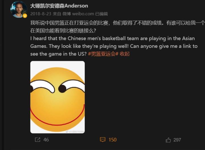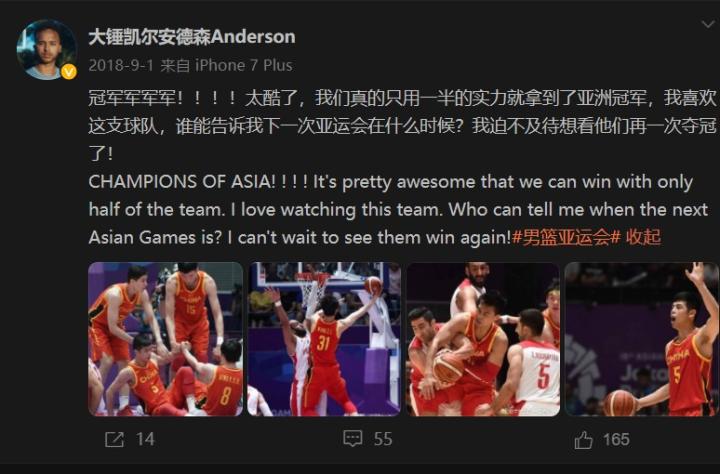 虽然显然安德森的微博后来肯定是交给团队运营了,但在营业频率上,安德森的团队相当勤快,而且十分接地气。中国男篮在18年亚运会夺冠的时候,安德森还自己发了几条微博,兴奋之情溢于言表;而且到现在,安德森的微博也基本每个比赛日后都有更新,比他国外社媒的更新频率高多了。