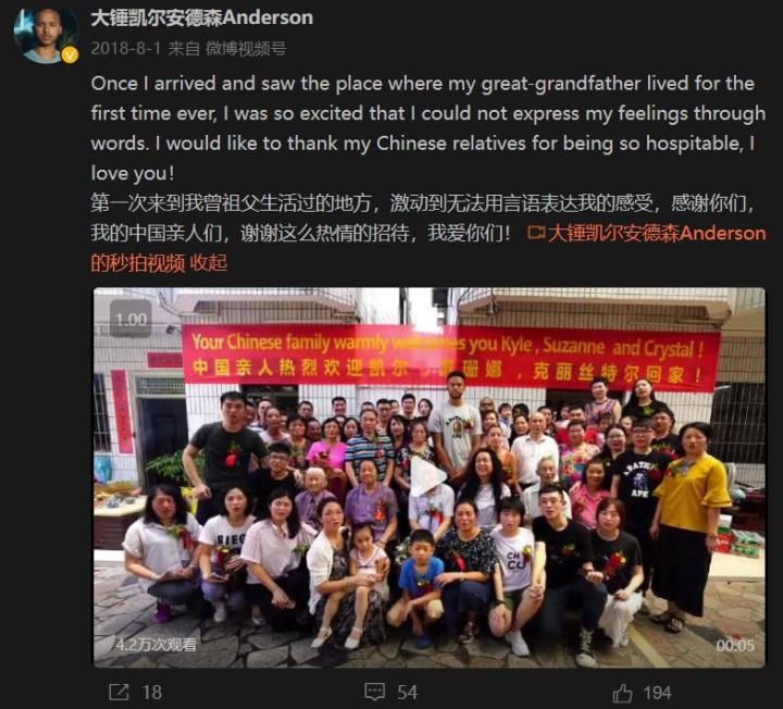而在采访中,安德森也不止一次表达过“中国就是我的根”这样的想法,而且也总是说18年的那次中国行是他人生中最幸福的时刻之一,因为“我见到了自己的家人,在地球另一端和自己有同样血缘的人”。