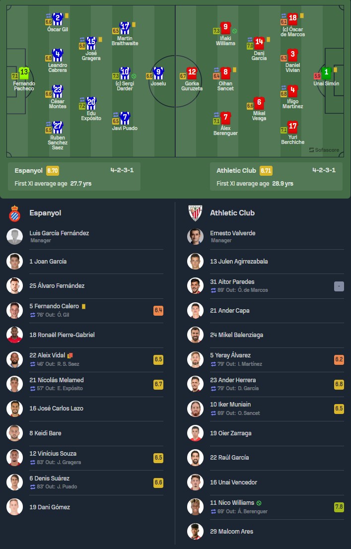 西班牙人首发:13-费尔南多-帕切科、27-鲁文-桑切斯(46'22-亚历克斯-比达尔)、23-塞萨尔-蒙特斯、4-卡夫雷拉、2-奥斯卡-希尔(76'5-卡莱罗)、20-埃杜(57'21-梅拉梅德)、15-格拉赫拉(83'12-维尼修斯-索萨)、10-塞尔希-达德尔、17-布莱斯维特、9-何塞卢、7-普阿多(83'6-德尼斯-苏亚雷斯)