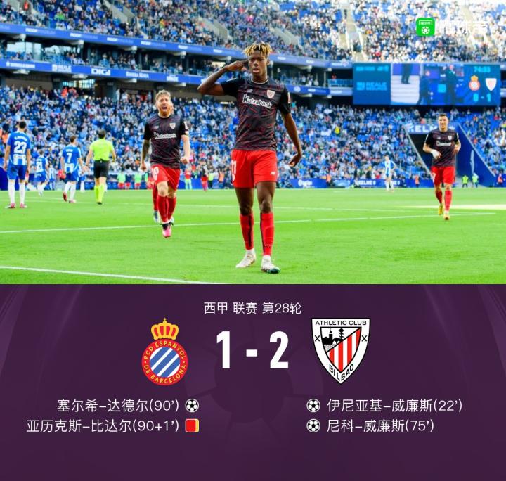 北京时间4月8日晚间22:15,西甲联赛第28轮,西班牙人主场迎战毕尔巴鄂竞技。上半场,伊尼亚基-威廉斯劲射破门,布莱斯维特破门被吹。下半场,尼科-威廉斯扩大比分,达德尔扳回一球,亚历克斯-比达尔两黄变一红被罚下。最终,西班牙人1-2毕尔巴鄂竞技。