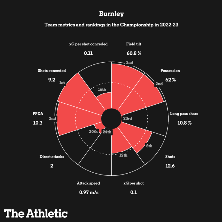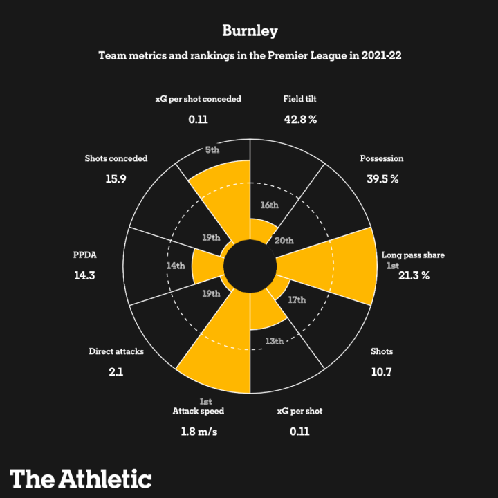 对比2021/22赛季,和22/23赛季到今年二月的数据统计,我们就能清晰地看出伯恩利天翻地覆的转变。虽然英超和英冠的对手水平不可同日而语,但一支球队的踢球风格还是可以通过关键数据看出来的。