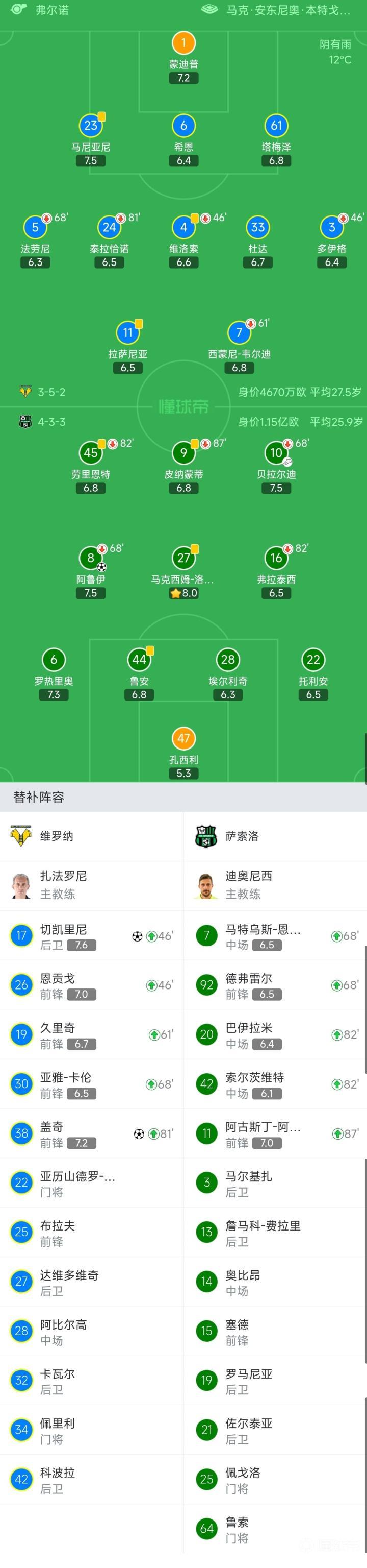 萨索洛首发:47-孔西利、22-托利安、28-埃尔利奇、44-鲁安、6-罗热里奥、16-弗拉泰西(82′42-索尔茨维特)、27-马克西姆-洛佩斯、8-阿鲁伊(68′7-马特乌斯-恩里克)、9-皮纳蒙蒂(87′11-阿古斯丁-阿尔瓦雷斯)、45-劳里恩特(82′20-巴伊拉米)、10-贝拉尔迪(68′92-德弗雷尔)
