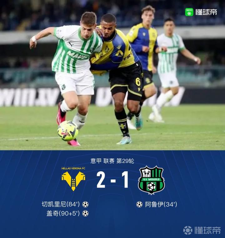 北京时间4月9日0:30,意甲第29轮,维罗纳主场对阵萨索洛,上半场贝拉尔迪助攻阿鲁伊头球破门,下半场恩贡戈开出角球,切凯里尼头球破门,比赛最后时刻孔西利传球失误,盖奇吊射绝杀。全场结束,维罗纳2-1萨索洛。