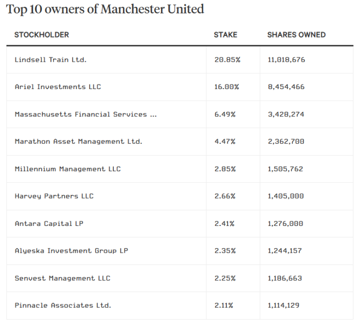 截至2022年12月的最后一个季度的证券交易委员会(SEC)文件强调了该俱乐部有三个除了格雷泽家族以外的重要股东。Antara资本购买了价值大约3000万美元的股票,Psquared资产管理公司购买了价值约2450万美元的股票,Eminence资本以1700万美元的价格入股。这些数字是由彭博社(Bloomberg)报道的。而Millennium管理公司也增持了超过1200%的股份,购买了约140万股。