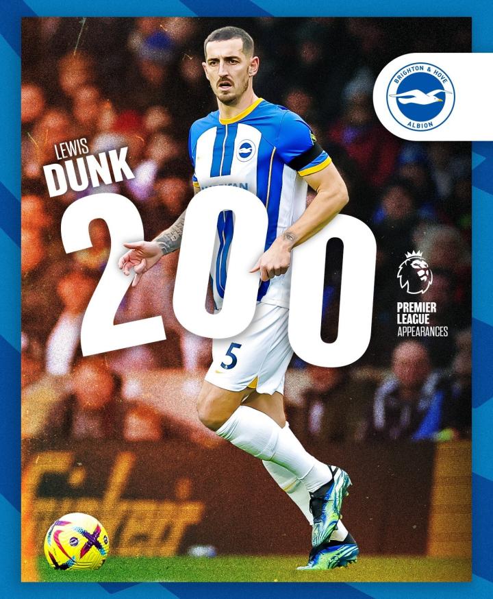 刘易斯-邓克,布莱顿队史首位达成英超200场里程碑的球员。