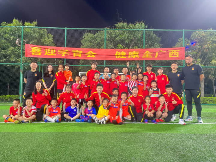4月8日晚,教练组与部分运动员来到百色市体育中心足球场,与百色万馆青少年俱乐部30多名师生进行了一场趣味十足的足球公益活动。