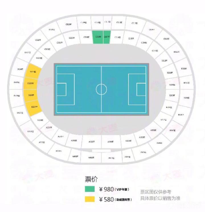 按照分区,980档位的座位分区位于中间最佳观赛区,580档位的座位位于球场左侧球门后方处。