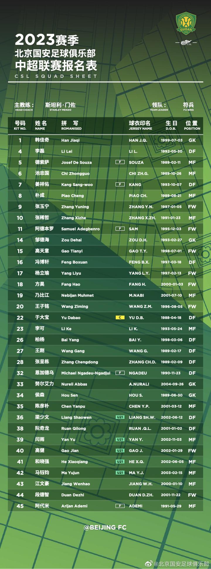 另外,新赛季,北京国安主帅依然是门佐利,符兵担任领队。