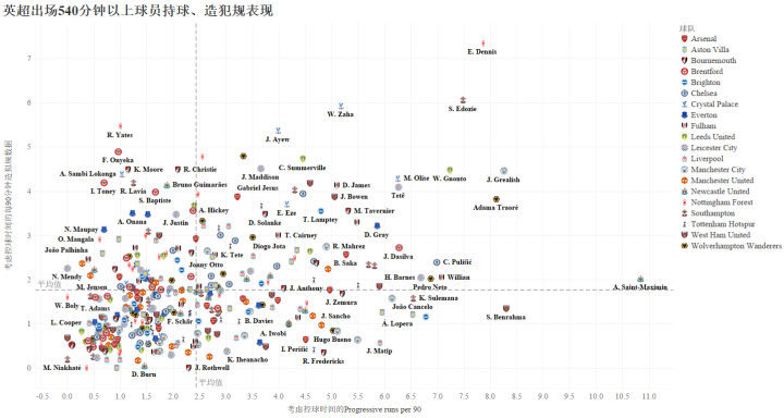 我最近发现持球可以和造犯规一起呈现,于是拿控球时间修正后的progressive run(横轴)和造犯规数据(纵轴)做了一张图表。 这张图表可以看到,圣-马克西曼在持球表现progressive run的产量上已经一骑绝尘了,但是他的造犯规效率并不高。 另外,格拉利什和特劳雷都可以很高效的把持球和造犯规结合起来。 而伦敦扎球王的向前持球推进产量并没有想象的高,也就是说明他并不做太多的带球长距离推进。但是他能高效利用好持球能力,比如造犯规能力很优秀。