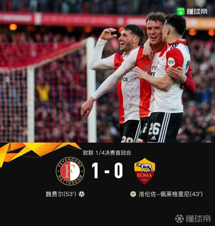 北京时间4月14日0:45,欧联1/4决赛首回合展开较量,费耶诺德主场对阵罗马。上半场迪巴拉因伤无法坚持被沙拉维换下,半场尾声阶段魏费尔手球送点,佩莱格里尼将点球打在门框上。下半场魏费尔禁区外凌空抽射弹地飞入网,之后亚伯拉罕伤退,随后伊巴涅斯头球攻门被门线解围。全场结束,罗马0-1不敌费耶诺德。