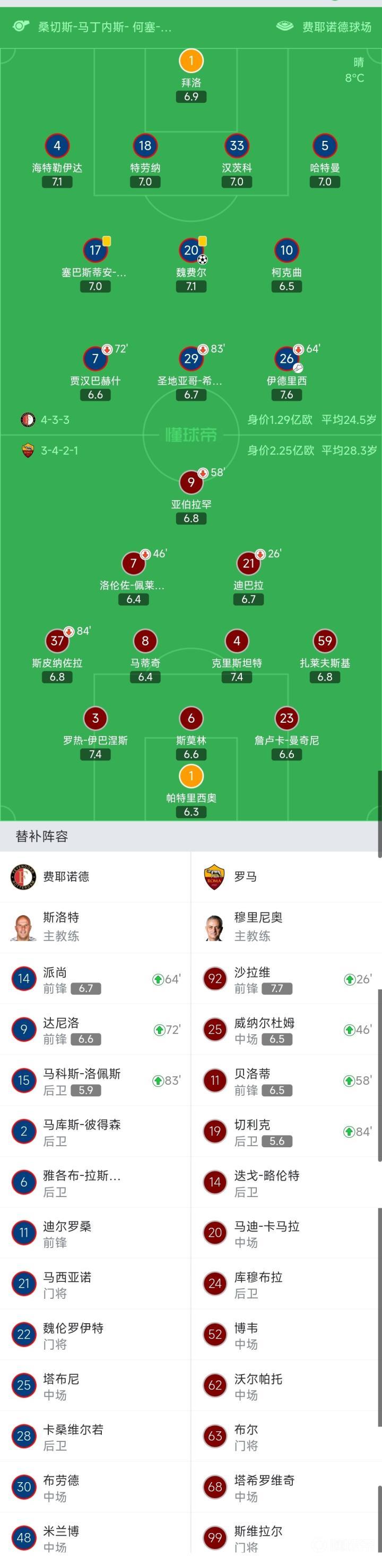 罗马两人伤退0-1费耶诺德,魏费尔世界波,佩莱格里尼失点