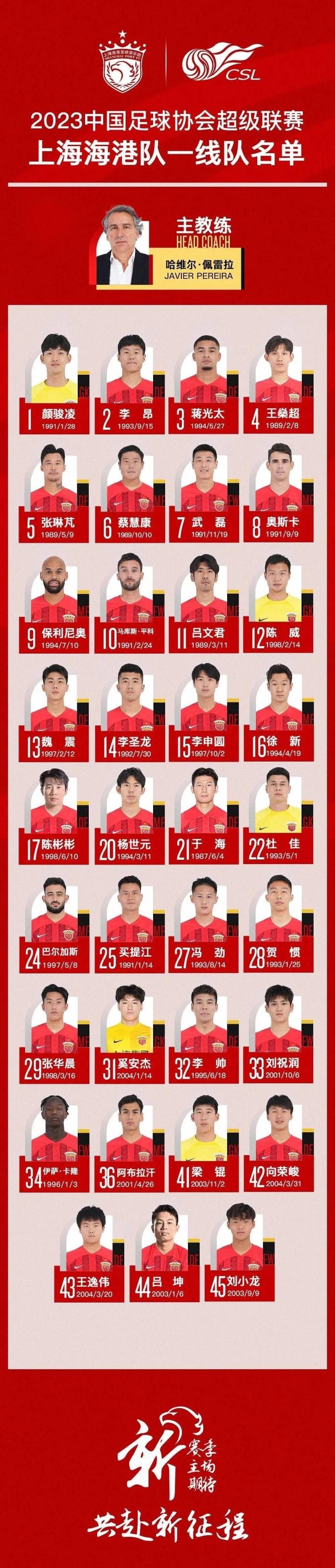 2023赛季中超联赛上海海港队一线队名单