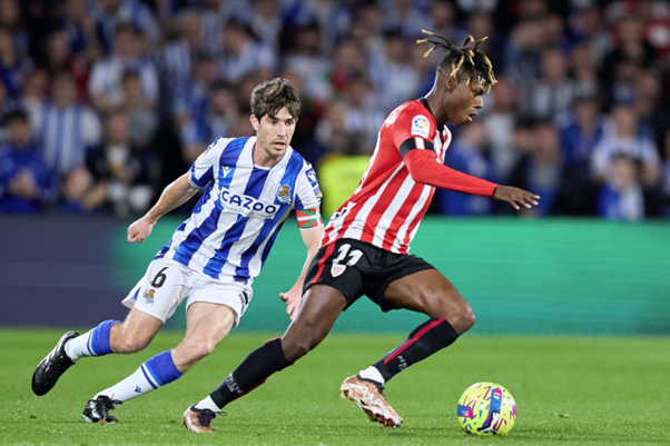 其中两名球员——梅里诺和尼科·威廉姆斯,是双方在本场比赛中的关键人物。截至目前,皇家社会中场核心梅里诺共有8次助攻,领衔西甲联赛助攻榜。而年轻的尼科·威廉姆斯则有64次盘带的亮眼表现,仅次于威尼修斯(Vini Jr)。
