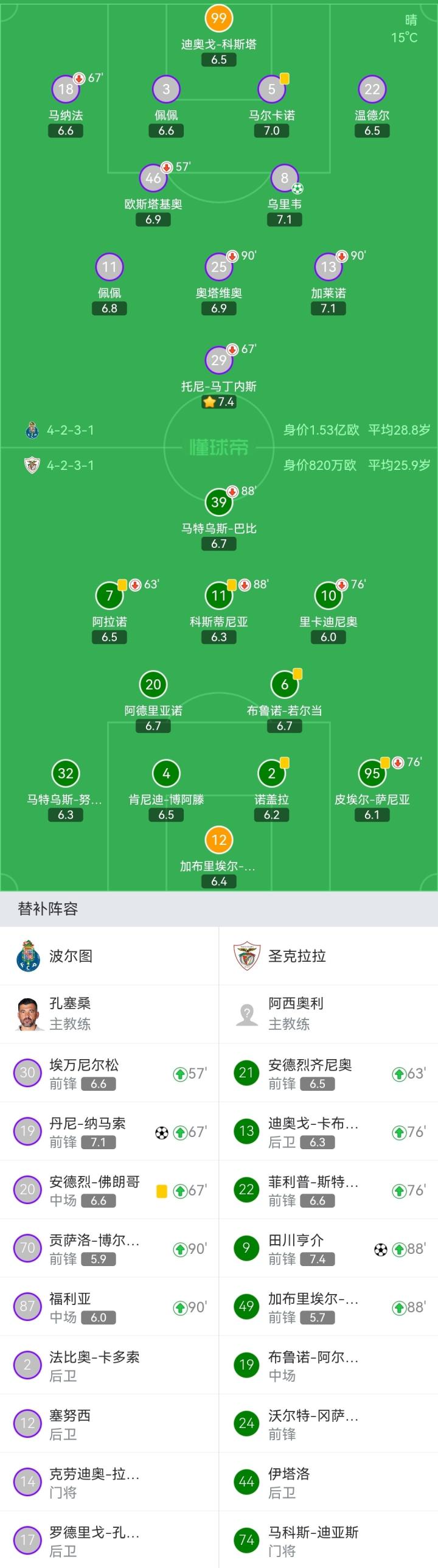 波尔图首发:99-迪奥戈-科斯塔、18-马纳法(67'20-安德烈-佛朗哥)、3-佩佩、5-马尔卡诺、22-温德尔、46-欧斯塔基奥(57'30-埃万尼尔松)、8-乌里韦、25-奥塔维奥(90'70-贡萨洛-博尔热斯)、11-佩佩、13-加莱诺(90'87-福利亚)、29-托尼-马丁内斯(67'19-丹尼-纳马索)