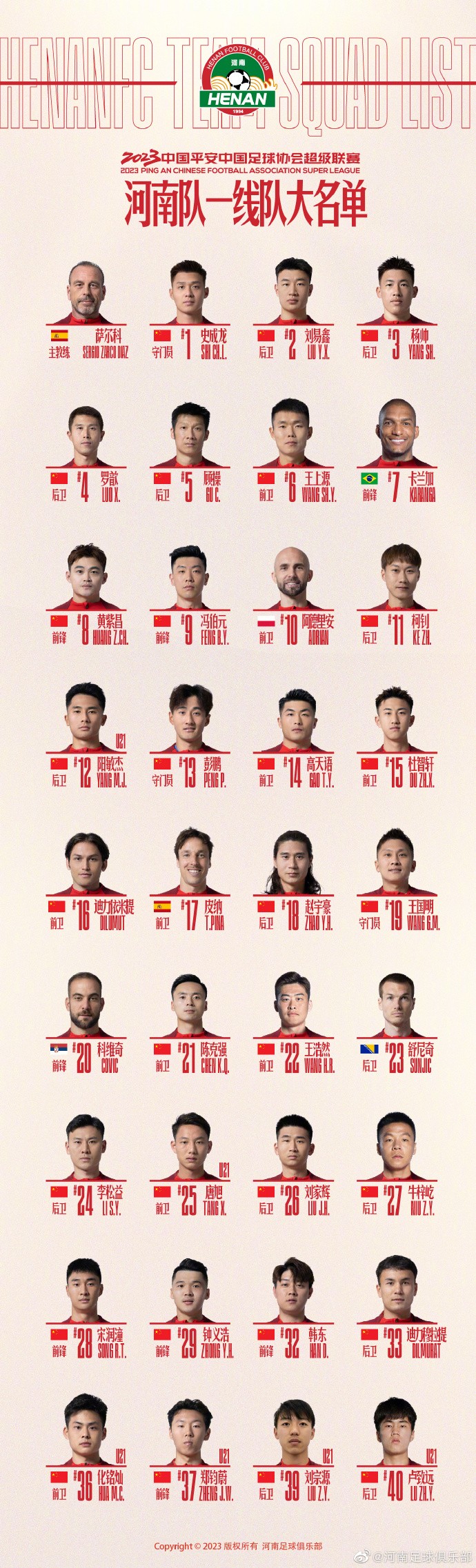 河南队新赛季大名单:卡兰加、阿德里安领衔,新援冯伯元9号