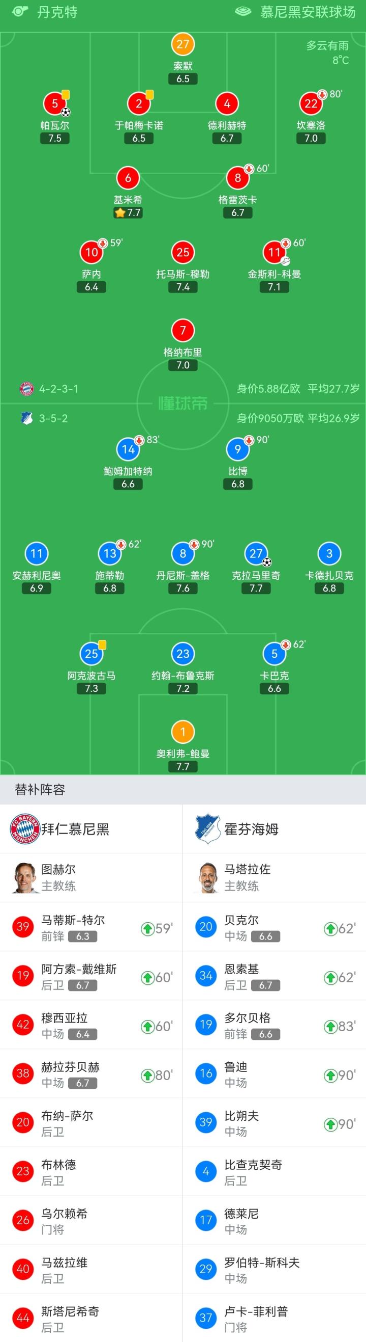 拜仁慕尼黑首发:27-索默、2-于帕梅卡诺、4-德利赫特、5-帕瓦尔、6-基米希、7-格纳布里、8-格雷茨卡(60'42-穆西亚拉)、10-萨内(59'39-马蒂斯-特尔)、11-金斯利-科曼(60'19-阿方索-戴维斯)、22-坎塞洛(80'38-赫拉芬贝赫)、25-托马斯-穆勒