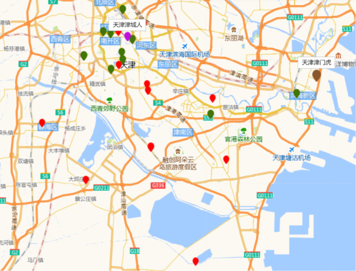 (图12)天津球队的地理分布,绿色为津超球队,红色为津甲球队