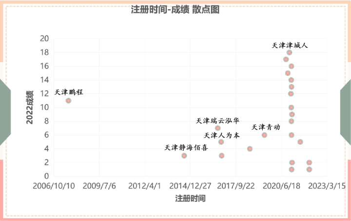 在所有津超/津甲的球队中,注册时间最早的为天津鹏程(2007/8/29)。刚开始注册的几家球队,都是以青训为主体产业的。而大部分津超/津甲的球队,都是在2020年之后才注册的,其中就包括天津津城人(2020/12/9)。这一方面意味着,天津最近的基层足球发展迅速;另一方面也意味着,在一个自下而上的体系中,昙花一现式的冲击,要比长期的耕耘更容易出成绩。
