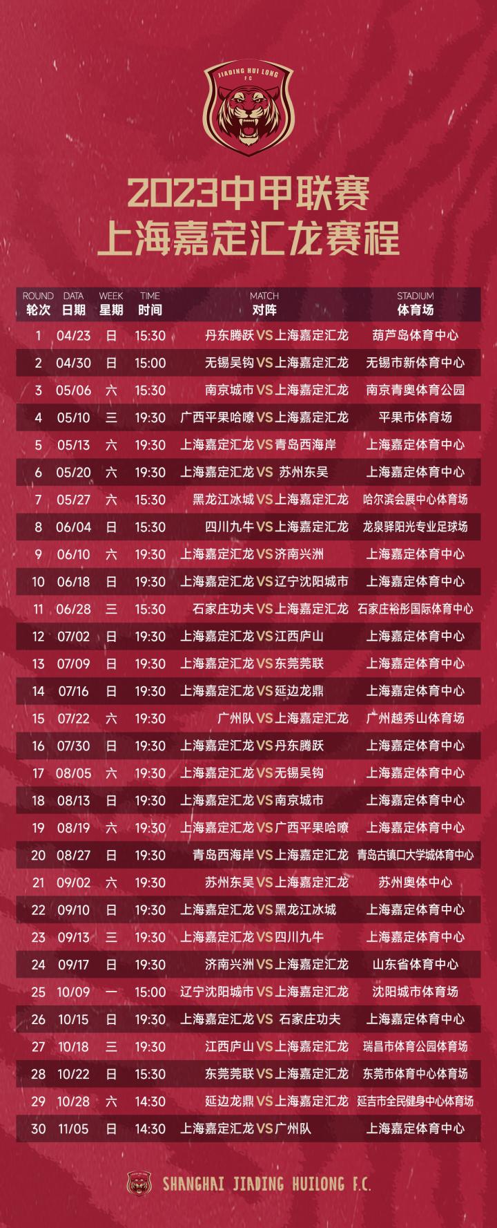 2023赛季中甲联赛上海嘉定汇龙赛程正式公布!