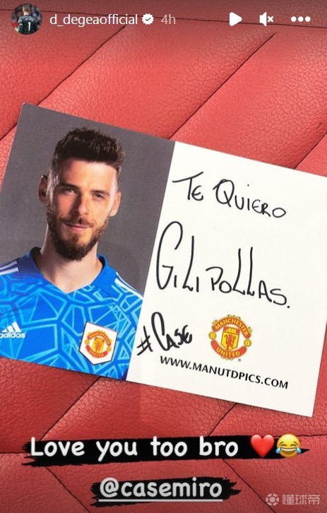 好甜,德赫亚收到卡塞米罗爱的小卡片,回复:我也爱你兄弟壳莉丝汀 @懂球帝2023-04-18 00:26本轮英超,曼联客场2-0力克诺丁汉森林,赛后,德赫亚收到了卡塞米罗写的小卡片。卡塞米罗在送给德赫亚的卡片上手写道:我爱你,混蛋(Te Quiero Gilipollas) ,另外还附上了自己的名字简写。德赫亚收到后在个人社媒晒出了这张卡片,并回复:“我也爱你兄弟。”,随后卡塞米罗又转发了德赫亚的动态,回复道:“你是最棒的。”展开更多