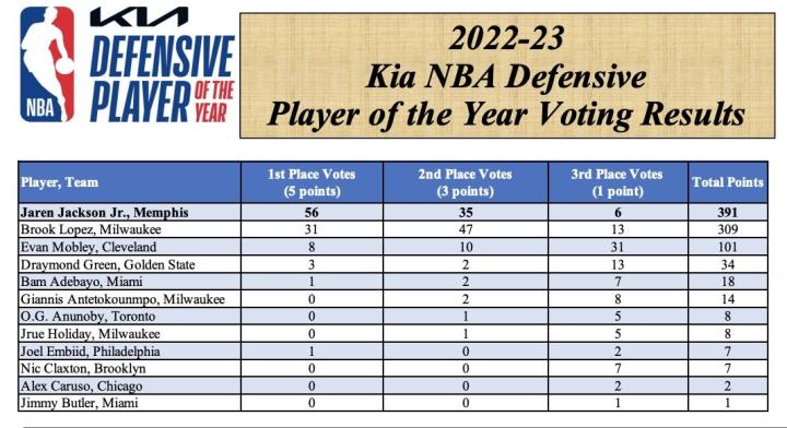 NBA官方:灰熊内线小贾伦-杰克逊当选本季常规赛最佳防守球员