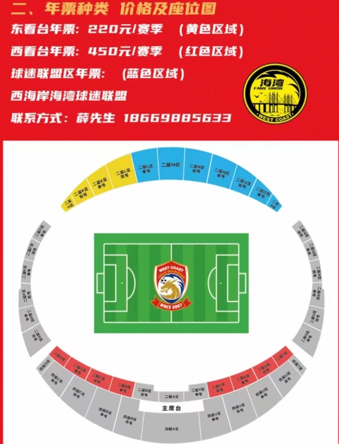 这是青岛西海岸首次迎来属于自己的中甲主场。根据公告,本赛季,青岛西海岸队的主场设在青岛西海岸大学城体育场。年票根据区域划分为3个档次:东看台年票为220元,西看台年票为450元,另外还有球迷联盟区年票。