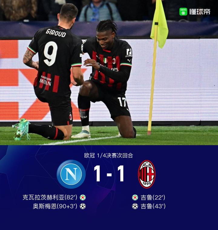 北京时间4月19日3:00,欧冠1/4决赛次回合,那不勒斯主场对阵AC米兰。上半场,波利塔诺内切远射打偏,马里奥-鲁伊撞倒莱奥被判罚点球,吉鲁主罚被梅雷特扑出,波利塔诺、马里奥-鲁伊伤退,半场临近结束,莱奥助攻吉鲁破门。下半场,克瓦拉茨赫利亚抽射打高,托莫里手球送点,克瓦拉茨赫利亚点球被迈尼昂扑出,奥斯梅恩头球破门扳回一分,最终,米兰客场1-1那不勒斯,总分2-1晋级,米兰时隔16年再次打进欧冠四强。