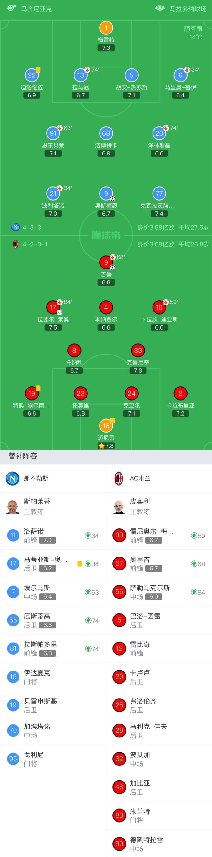 那不勒斯首发:1-梅雷特、22-迪洛伦佐、13-拉马尼(74'55-厄斯蒂高)、5-胡安-热苏斯、6-马里奥-鲁伊(34'17-马蒂亚斯-奥利韦拉)、91-恩东贝莱(63'7-埃尔马斯)、68-洛博特卡、21-波利塔诺(34'11-洛萨诺)、20-泽林斯基(74'81-拉斯帕多里)、77-克瓦拉茨赫利亚、9-奥斯梅恩