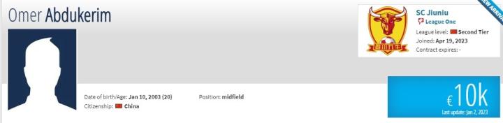 原淄博齐盛球员吾麦尔-阿布都克力木加盟四川九牛。吾麦尔今年20岁,司职中场,曾效力新疆领梦者、淄博齐盛。上赛季他在淄博齐盛出场5次。