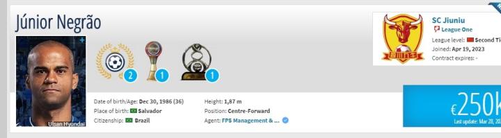 儒尼奥尔-内格朗今年36岁,巴西籍,司职前锋,他曾在巴西、葡萄牙、比利时、瑞士、泰国、韩国等国家踢球。2021年离开蔚山现代加盟长春亚泰,2021赛季斩获中超联赛最佳射手。2022赛季在亚泰队出场20次,打进9球。