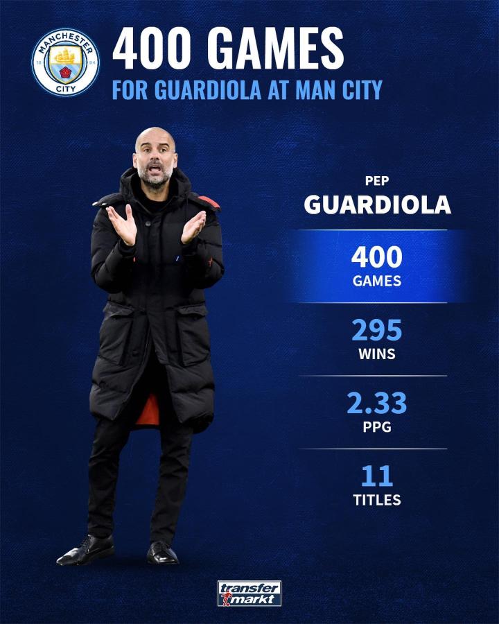 瓜迪奥拉达成执教曼城400场里程碑