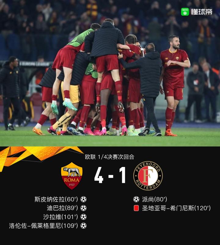罗马加时总分4-2费耶诺德晋级四强,迪巴拉救主,佩7传射