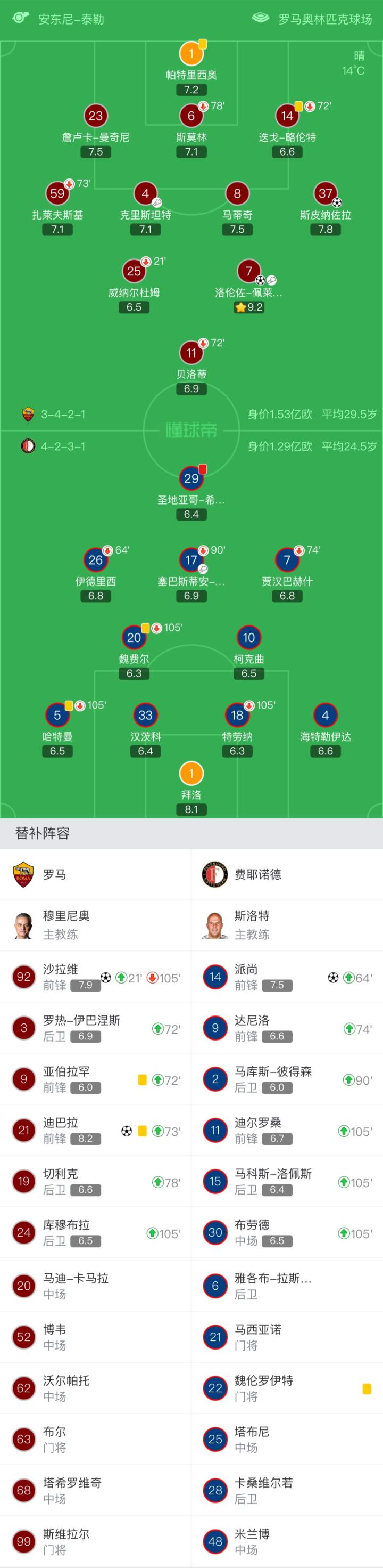 罗马首发:1-帕特里西奥、14-迭戈-略伦特(73'3-伊巴涅斯)、6-斯莫林(78'19-切利克)、23-曼奇尼、37-斯皮纳佐拉、8-马蒂奇、4-克里斯坦特、59-扎莱夫斯基(73'21-迪巴拉)、7-佩莱格里尼、25-威纳尔杜姆(21'92-沙拉维)(105'24-库穆布拉)、11-贝洛蒂(73'9-亚伯拉罕)