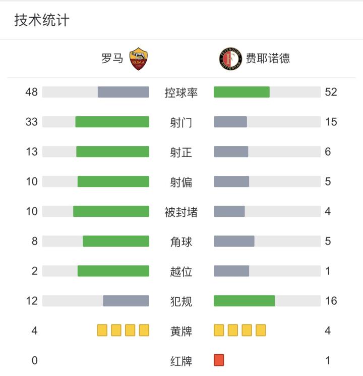 北京时间4月21日凌晨3点,欧联1/4决赛次回合展开一场焦点战役,罗马主场对阵费耶诺德,本场比赛当值主裁判为安东尼-泰勒。上半场,两队拼抢相当激烈,威纳尔杜姆因伤被换下。在一次小规模冲突中,罗马教练人员因阻止对方触球被红牌罚下。下半场,斯皮纳佐拉低射破门。随后,亚伯拉罕助攻克里斯坦特建功,但是被吹犯规在先。斯莫林因伤无法坚持被换下,希曼斯基助攻派尚得分帮助客队总比分领先。迪巴拉最后时刻倒地破门扳平总比分。90分钟战罢,双方进入加时赛。加时赛亚伯拉罕助攻沙拉维反超总比分,随后,佩莱格里尼补射建功彻底锁定胜局。最后时刻,圣地亚哥-希门尼斯蹬踏曼奇尼,被主裁判红牌罚下。全场比赛结束,罗马主场4-1击败费耶诺德,并且以总比分4-2淘汰对手晋级欧联四强。