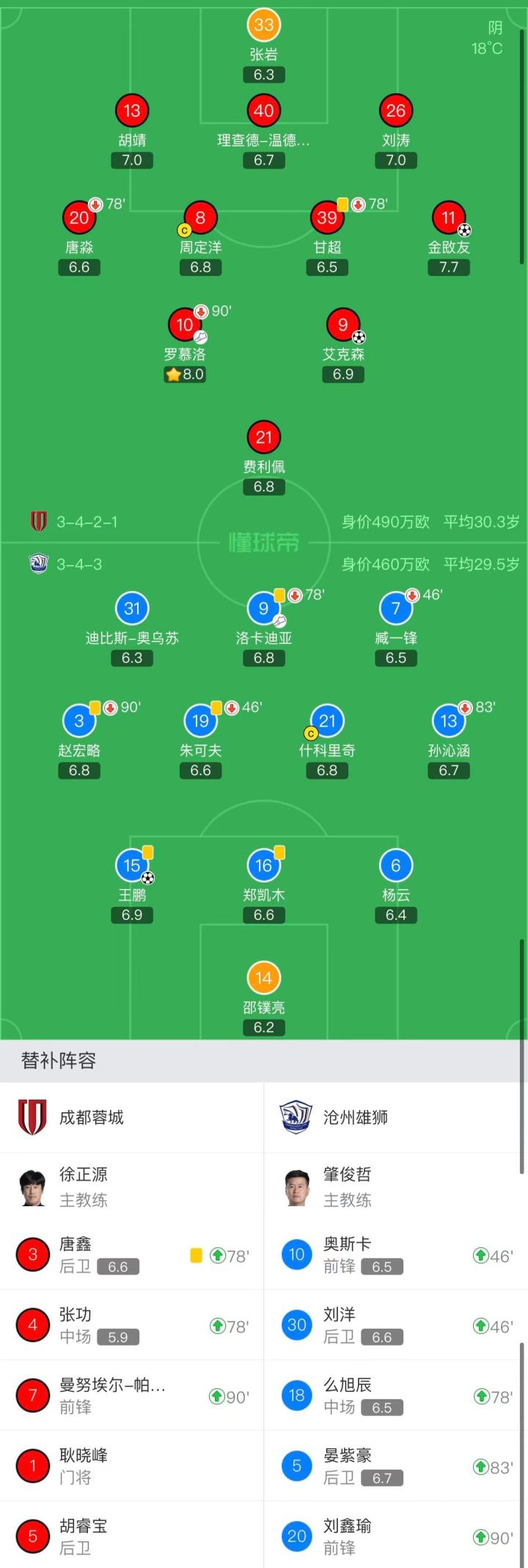 成都蓉城首发:33-张岩、11-金敃友、13-胡靖、20-唐淼(78'4-张功)、26-刘涛、40-理查德-温德比希勒、8-周定洋、10-罗慕洛(90+4'7-曼努埃尔-帕拉西奥斯)、39-甘超(78'3-唐鑫)、9-艾克森、21-费利佩